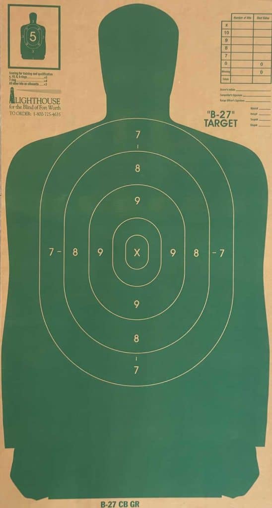 A B27 target is used and must be 24 inches wide and 45 inches high. Applicants must score a 70% or higher to pass. That is 175 points out of a possible 250 points. There are multiple rings on the target for scoring. Everything in the 8 ring and in is 5 points, inside the 7 ring is 4 points and outside the 7 ring but still in the body is 3 points.